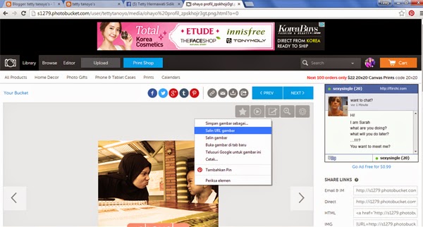 URL gambar bisa didapatkan dari Photobucket (setelah kita meng-upload gambar tersebut), sebelumnya kita harus membuat akun di photobucket, keuntungannya adalah kita bisa menyimpan file gambar atau foto di internet dan kita dengan mudah mendapatkan URL gambar tersebut.