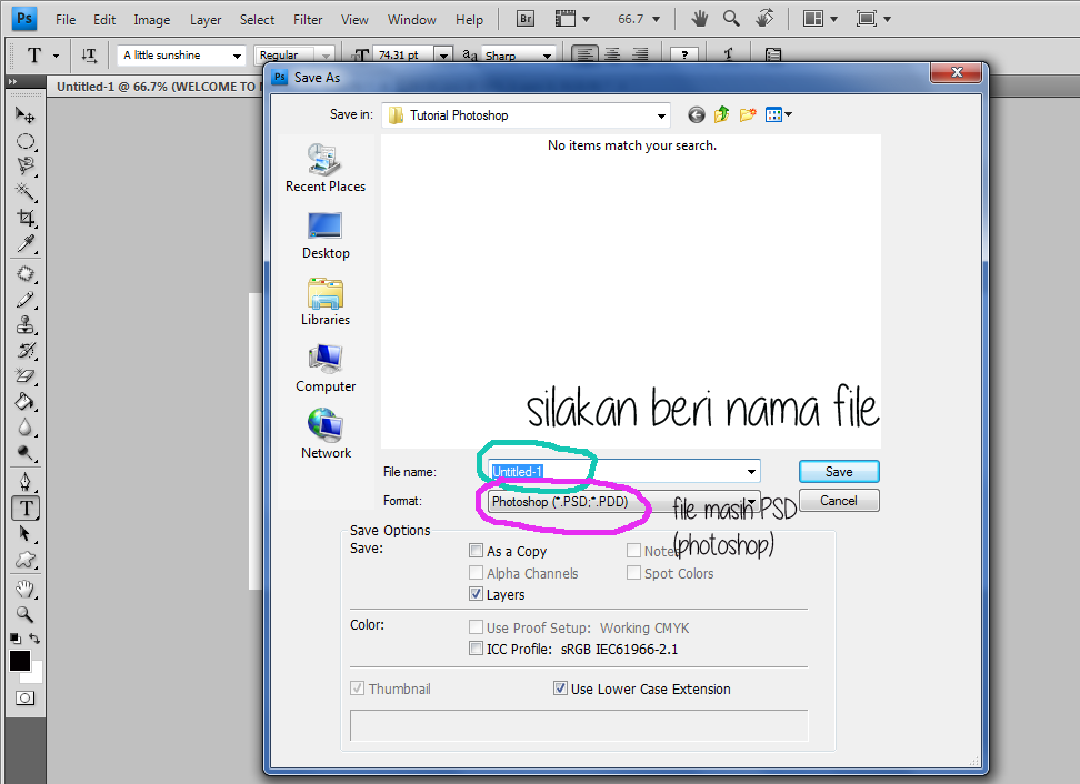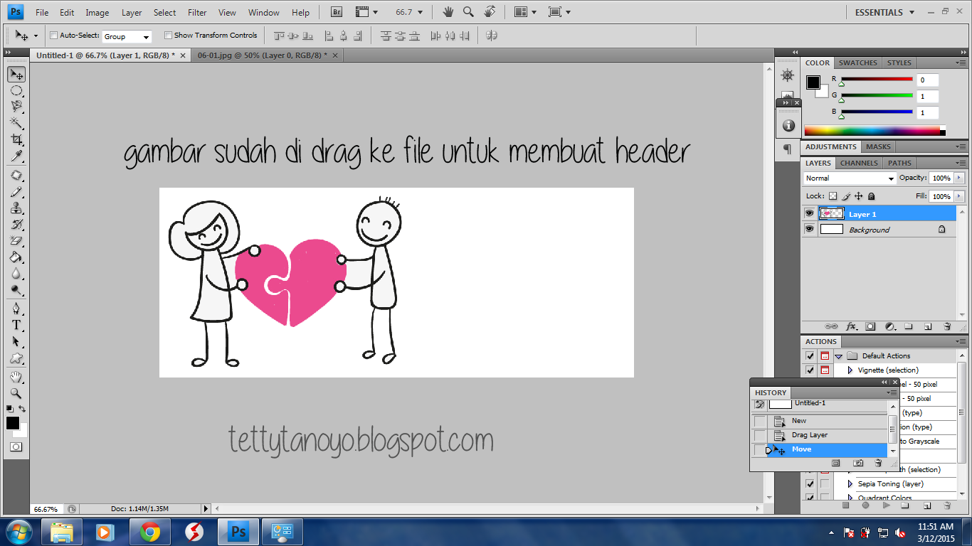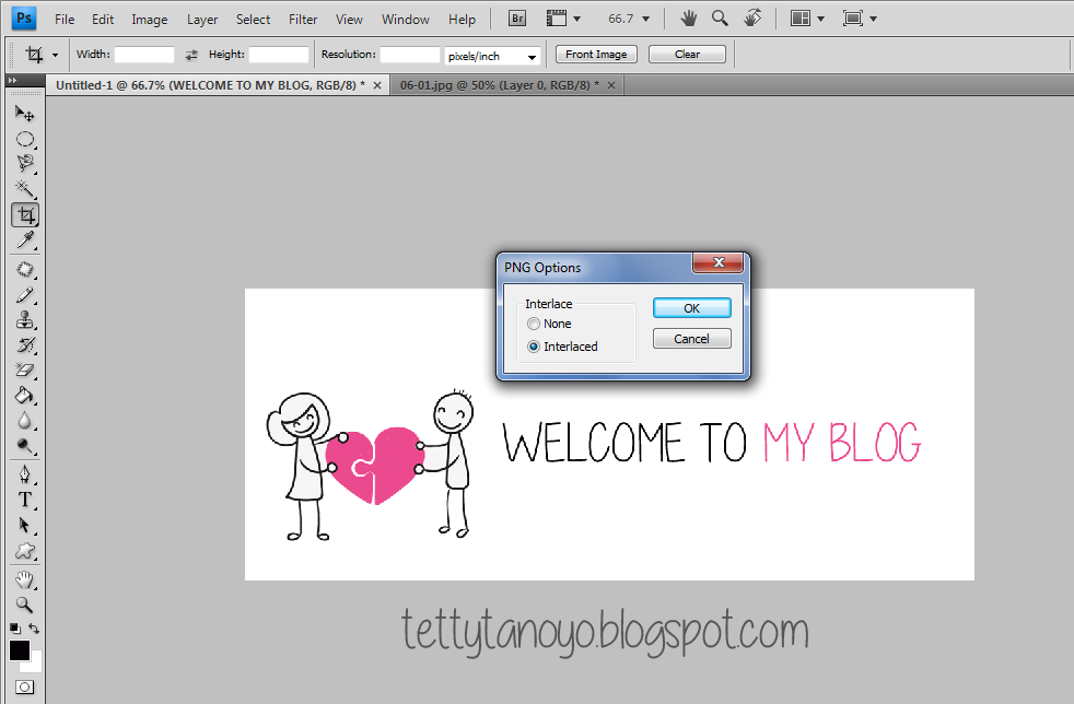 PS: File dengan jenis PSD adalah file yang suatu saat bisa kita edit kembali menggunakan Photoshop. Sedangkan untuk menerapkan hasil karya kita pada BLOG, maka kita harus mengganti eksistensi file menjadi JPG atau PNG.