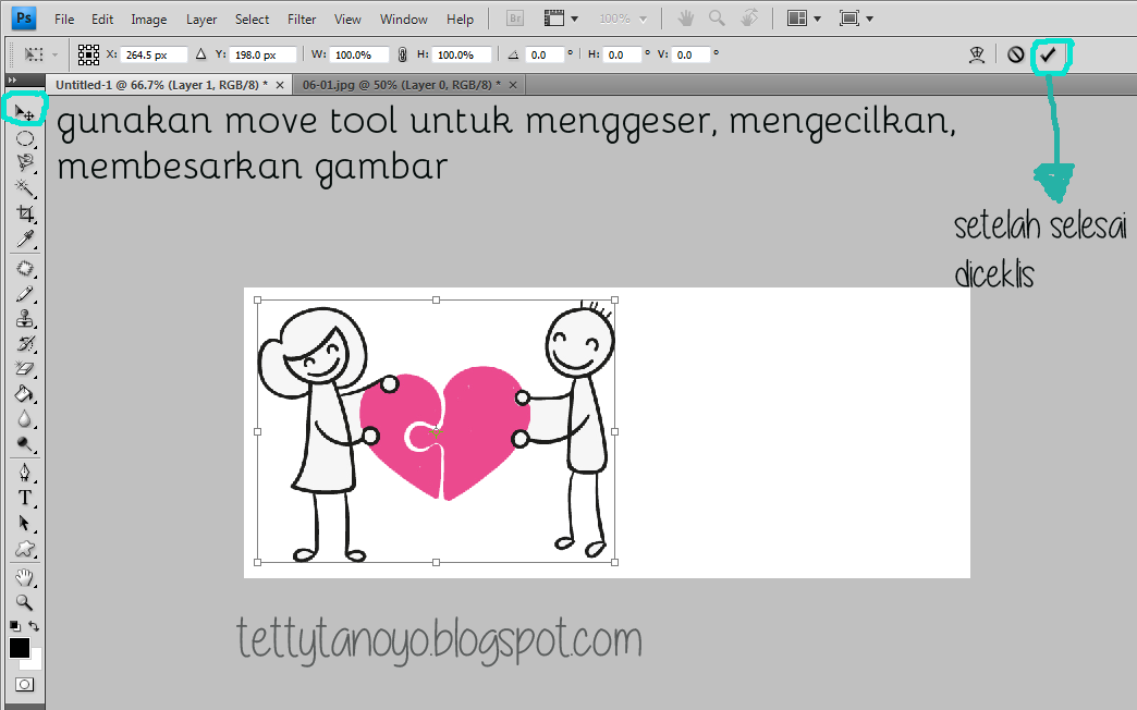Apabila gambar menjadi terlalu besar atau terlalu kecil maka klik Move Tool, kemudian CTRL+T