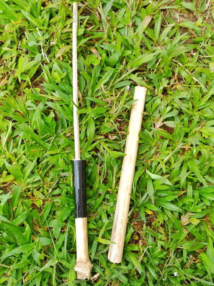 | Kifah dan Abbiy bikin mainan tradisional dari bambu, kalau urang sunda bilangnya bebedilan, atau pistol-pistolan lah kurang lebih artinya. |
