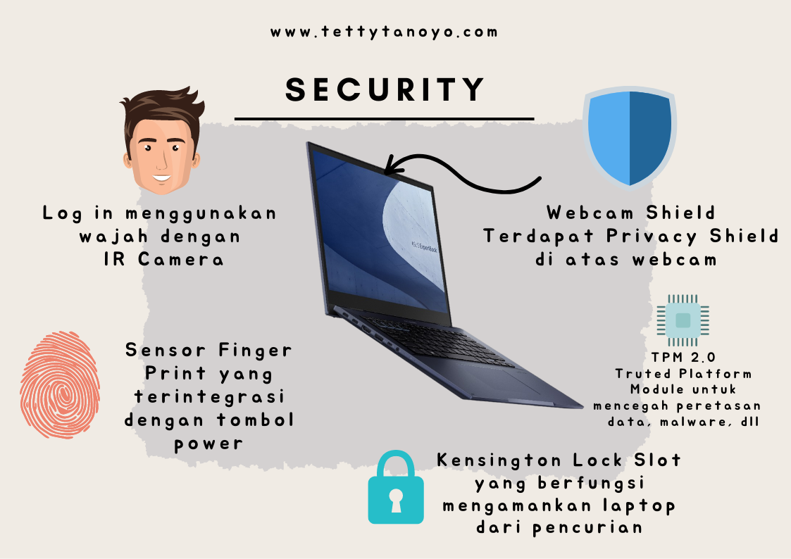 6. ASUS ExpertBook B7 Flip menawarkan kemudahan dan keamanan ekstra. Berbagai keperluan input dan out port tersedia di dalam laptop ini. Serta keamanan ekstra seperti Webcam Shield, sebuah slide penutup kamera webcam ketika kita memerlukan privasi, log in menggunakan wajah dan finger print, serta keamanan ekstra dari TPM 2.0 untuk mencegah malware, peretasan dan pencurian data. Serta Kensington Lock Slot, yang digunakan untuk mengamankan laptop secara fisik agar terhindar dari pencurian.