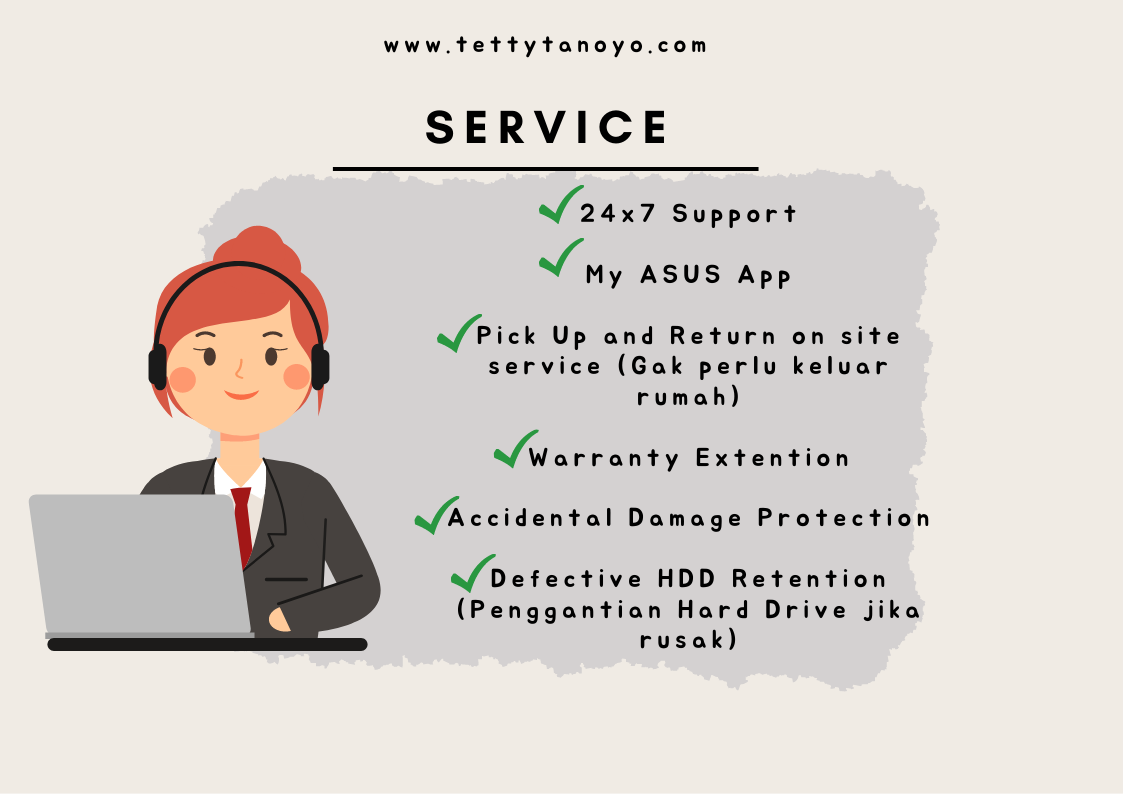 Layanan purna jual ASUS pun sangat baik, ASUS memberikan layanan ekstra seperti Warranty Extention hingga 5 tahun, Accidental Damage Protection (ADP) dengan garansi perlindungan hingga 100%, layanan Onsite Service yang merupakan layanan door to door sehingga kita tak perlu keluar rumah. Hingga VIP Support Line yang dapat memberikan dukungan teknis khusus.