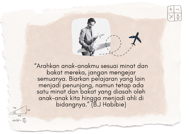 “Arahkan anak-anakmu sesuai minat dan bakat mereka, jangan mengejar semuanya. Biarkan pelajaran yang lain menjadi penunjang, namun tetap ada satu minat dan bakat yang diasah oleh anak-anak kita hingga menjadi ahli di bidangnya.”
