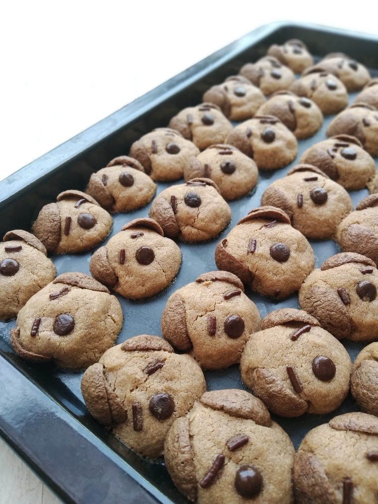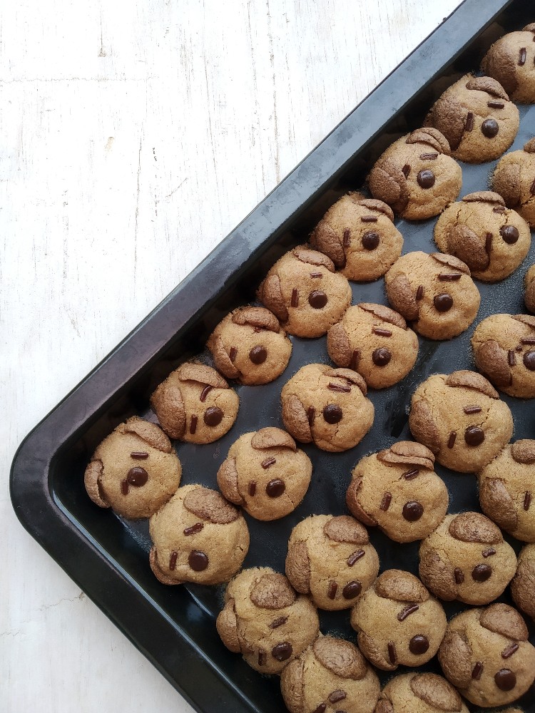 5. Bentuk bulatan dengan adonan, kemudian hias menggunakan meises, chococips dan koko crunch sebagai mata, hidung, dan telinga "doggie" nya ya.