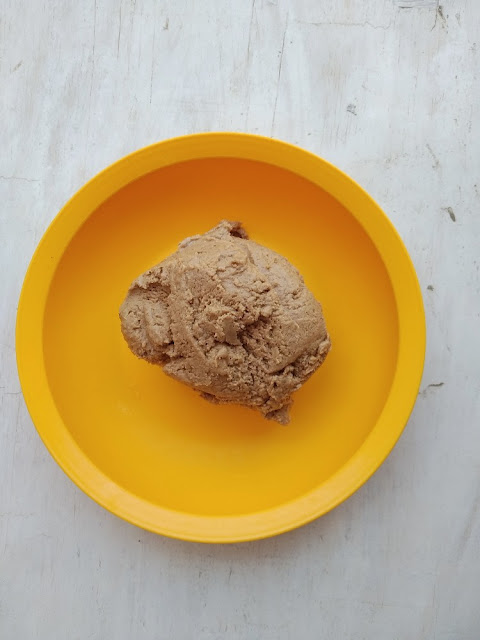 4. Masukkan campuran tepung, aduk rata menggunakan spatula hingga adonan dapat dipulung.
